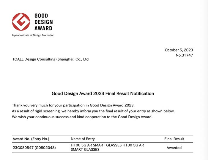 近日世界頂級設(shè)計(jì)獎(jiǎng)之一GOOD DESIGN AWARD已于10月5日公布了2023年度獲獎(jiǎng)?wù)呙麊巍?TOALL凸凹設(shè)計(jì)的HiAR H100 5G AR SMART GLASSES在全球5447件參賽作品中脫穎而出,榮獲GOOD DESIGN AWARD 2023年度的優(yōu)秀設(shè)計(jì)獎(jiǎng)。