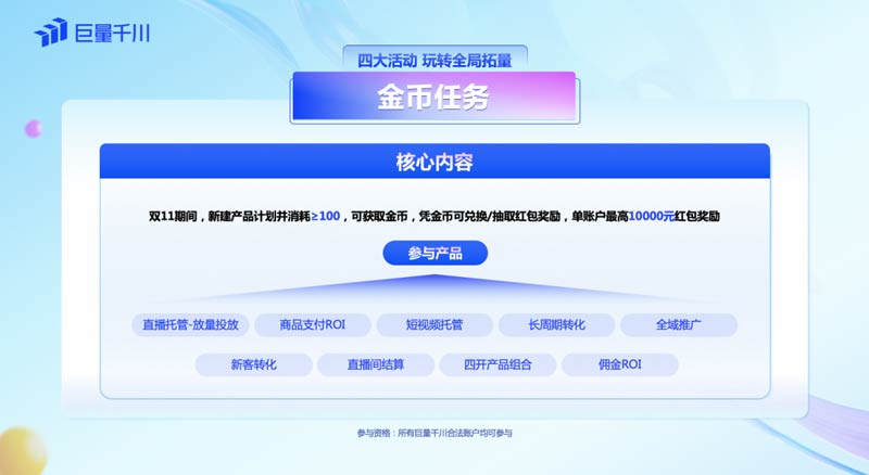金幣任務(wù)同樣也是適配所有巨量千川合法賬戶,在雙11期間,新建產(chǎn)品計劃并消耗不低于100,賬戶就可以獲取金幣。商家可以憑借所獲取的金幣兌換或者抽取紅包獎勵,單賬戶紅包獎勵最高可達(dá)10000元。