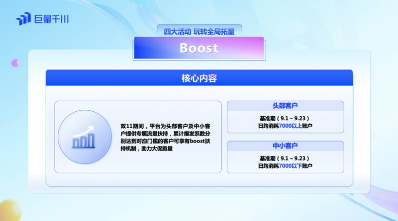 雙11期間,平臺將為頭部商家和中小型商家提供專屬流量扶持,累計爆發(fā)系數(shù)分別達(dá)到對應(yīng)門檻的客戶,可以享有Boost扶持機(jī)制,幫助商家更好地在激烈的競爭中獲取流量。
