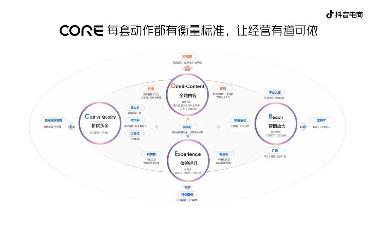 過去半年,抖音電商沿著流量尋跡問路,找出了提升流量獲取的4組經(jīng)營動作,全面迭代經(jīng)營方法論,總結(jié)為"CORE"4個字母: