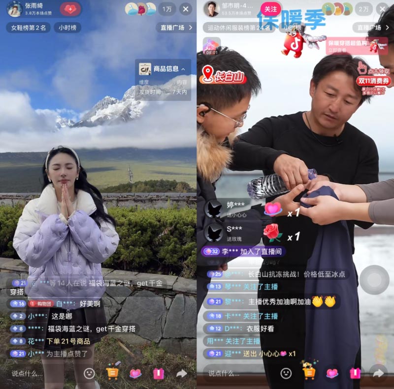主打“真實(shí)場(chǎng)景”直播并不少見,但抖音電商雙11保暖季的實(shí)踐更具突破性:在玉龍雪山海拔4500米的觀景臺(tái)上,張雨綺身著時(shí)尚冬裝從容漫步,以雪山為天然幕布,用實(shí)際行動(dòng)詮釋了“風(fēng)度與溫度可以兼得”;