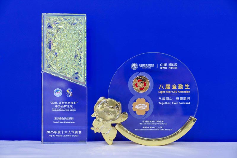 除了銷售額的持續(xù)攀升,Mootaa茉汰在品牌建設(shè)方面也同步邁進(jìn),收獲累累碩果。本屆進(jìn)博會上,Mootaa茉汰不僅迎來了中國國際進(jìn)口博覽局副局長李國清的親臨指導(dǎo),獲頒“八屆全勤生紀(jì)念獎牌”,還在“品牌,讓世界更美好”中外品牌論壇中,憑借綠色天然系列產(chǎn)品榮膺“2025年度十大人氣首發(fā)”獎項。