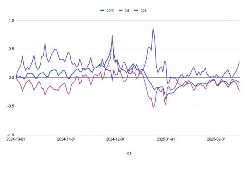 Meta數(shù)據(jù)顯示,節(jié)后至1月中旬廣告成本下降約50%,但轉(zhuǎn)化率依舊維持高位(⑦)。這段被稱為“Q5”的階段,成為越來越多品牌進行再營銷與品牌沉淀的窗口期。