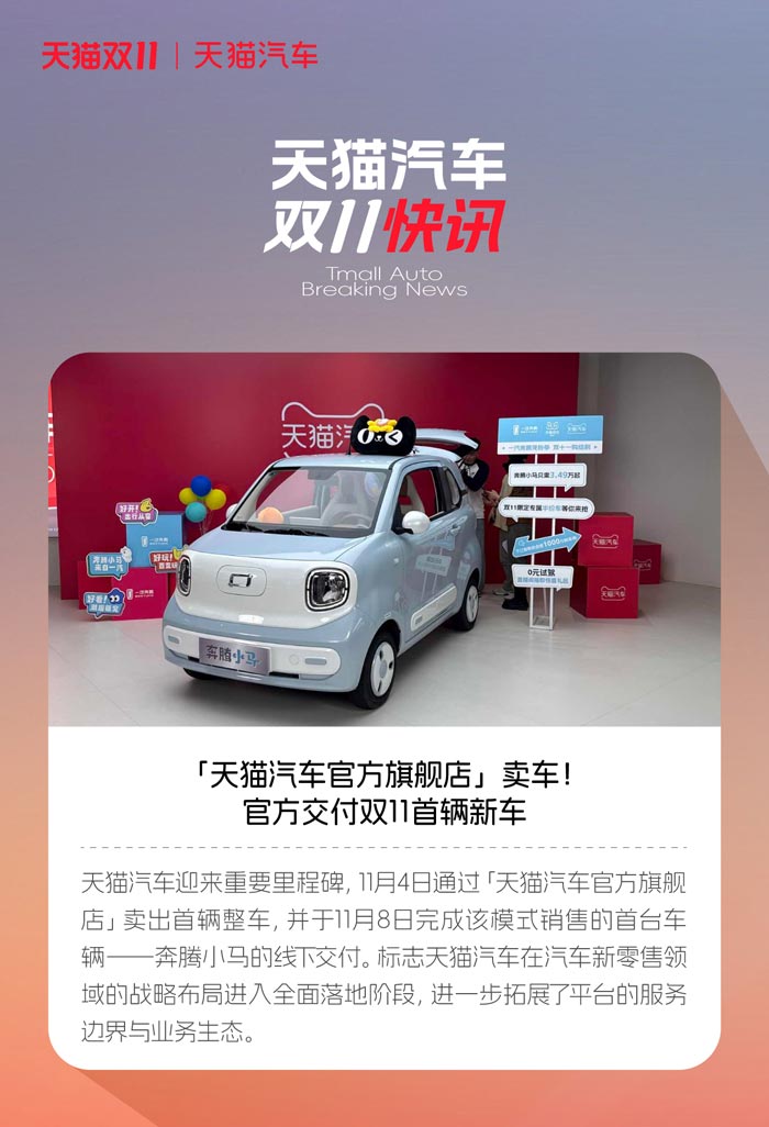 11月4日,通過「天貓汽車官方旗艦店」賣出首輛整車,并于11月8日完成該模式銷售的首臺(tái)車輛——奔騰小馬的線下交付。此次交付不僅是天貓汽車整車銷售業(yè)務(wù)體系的首次成功實(shí)踐,更為后續(xù)規(guī)模化推進(jìn)奠定了堅(jiān)實(shí)基礎(chǔ)。