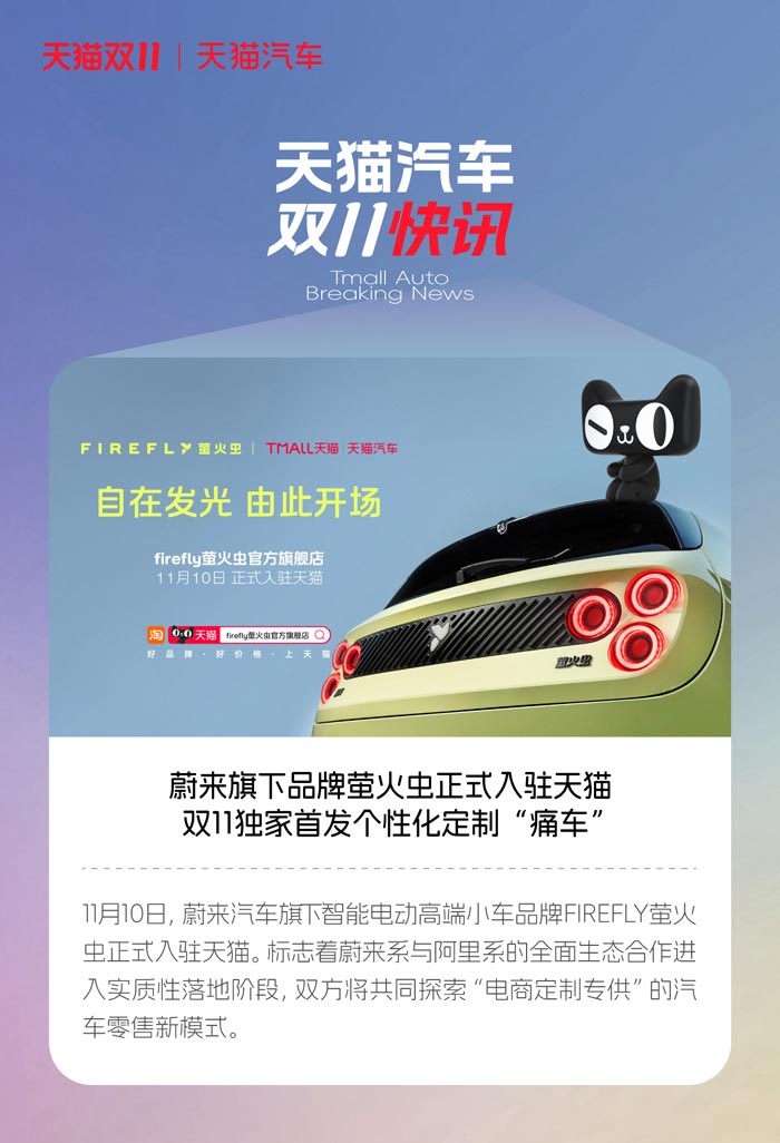 11月10日 —— 蔚來汽車旗下智能電動(dòng)高端小車品牌Firefly螢火蟲正式入駐天貓。標(biāo)志著蔚來系與阿里系的全面生態(tài)合作進(jìn)入實(shí)質(zhì)性落地階段,雙方將共同探索 “電商定制專供” 的汽車零售新模式。