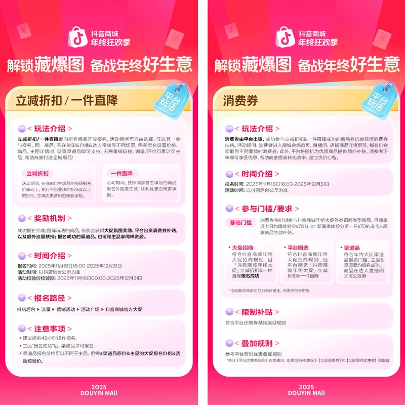 年終消費旺季將至,「2025抖音商城年終狂歡季」也將在12月3日正式啟動。這不僅是商家沖擊年度目標(biāo)的關(guān)鍵節(jié)點,也是布局新增長的黃金窗口。為助力商家把握增長機遇,活動發(fā)布年終大促“藏爆圖”,從價格力、內(nèi)容力、爆發(fā)力、營銷力等多個維度,為商家備戰(zhàn)「2025抖音商城年終狂歡季」提供清晰指引,助力商家在激烈競爭中贏得確定性增長。