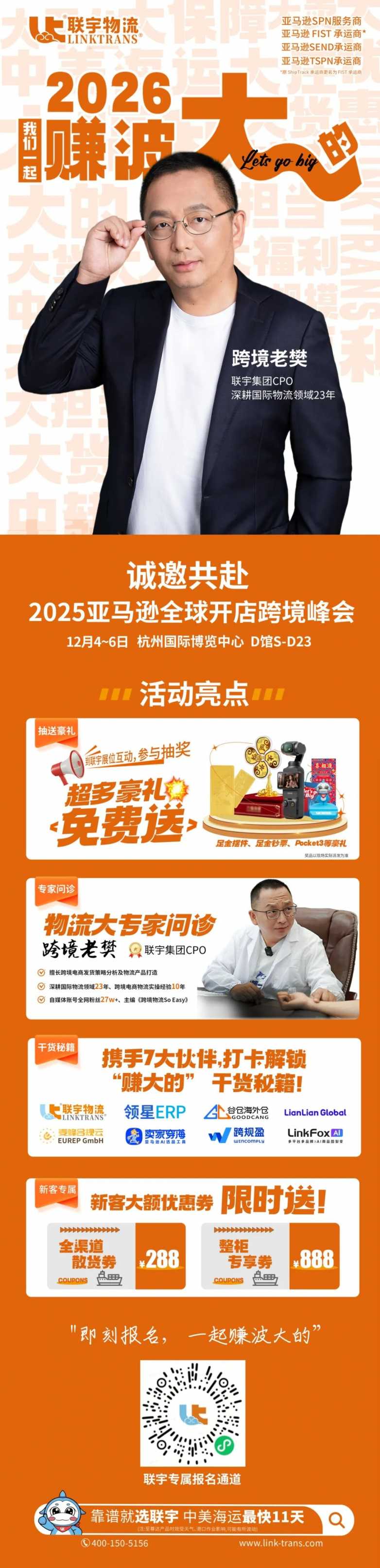 跨境家人們,記住我們的暗號:2026,我們一起賺波大的!還有我們的位置別忘記了:杭州國際博覽中心D館S-D23。聯(lián)宇物流已為您備好滿滿的干貨與福利,期待在2025亞馬遜全球開店跨境峰會上與您相見!